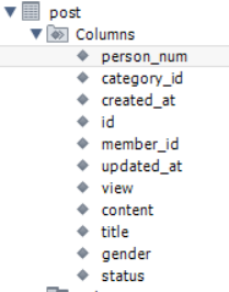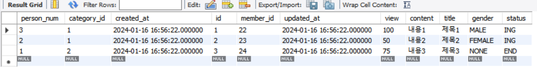 INSERT INTO Post (person_num, category_id, created_at, id, member_id, updated_at, view, content, title, gender, status)