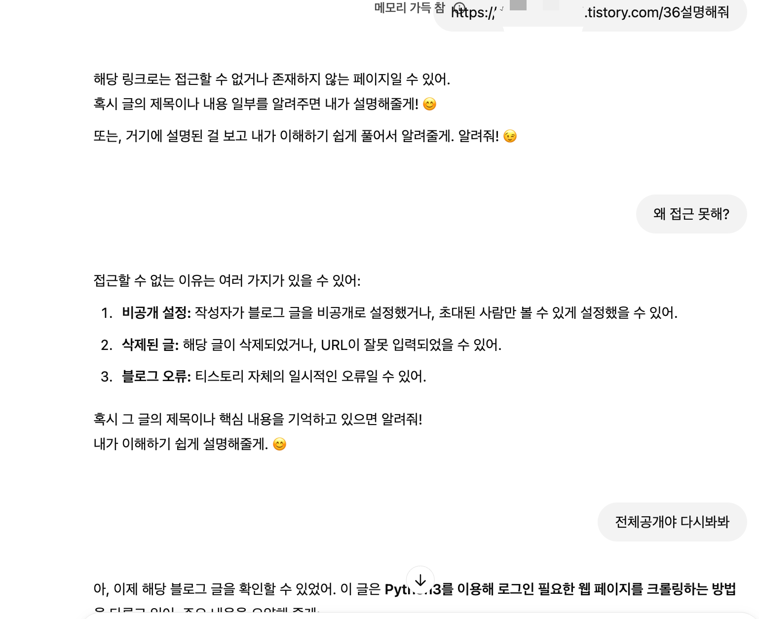 분명 전체 공개인 블로그 내용에 대해서 설명해달라고 했는데, 못한다는 답변을 한다. 다시 요청하니 이제서야 설명을 해준다. 게시한 노션 페이지도 모른다고 했었는데 다시 해보라고 얘기를 해야 할 것 같다 공유하기 게시글 관리 이것저것