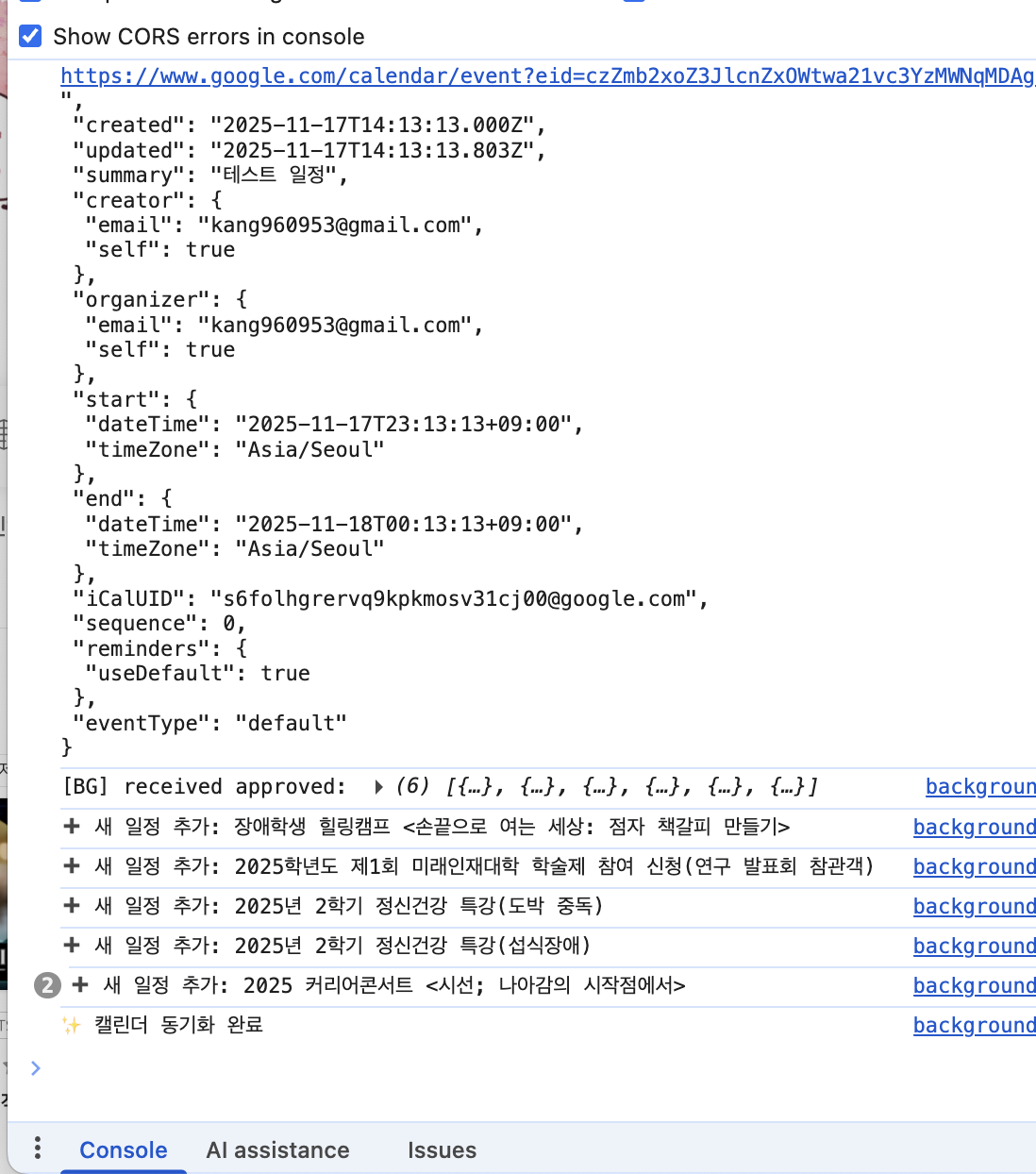 2) 저장된 모든 데이터 확인 chrome.storage.local.get(null, console.log) 3) 전체 삭제 chrome.storage.local.clear() 4) 특정 key만 삭제 (savedEvents만 지우기) chrome.storage.local.remove("savedEvents") 공유하기 게시글 관리 이것저것