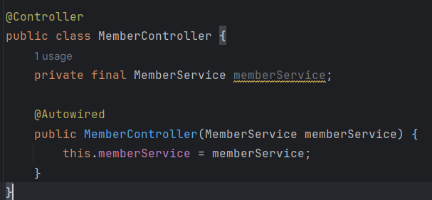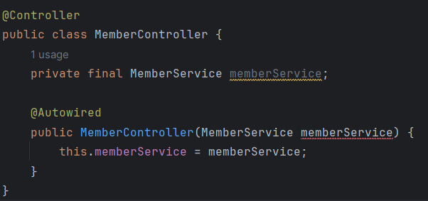 @Autowired를 사용하면 컨테이너가 자동으로 memberservice를 생성해서 관리해준다.